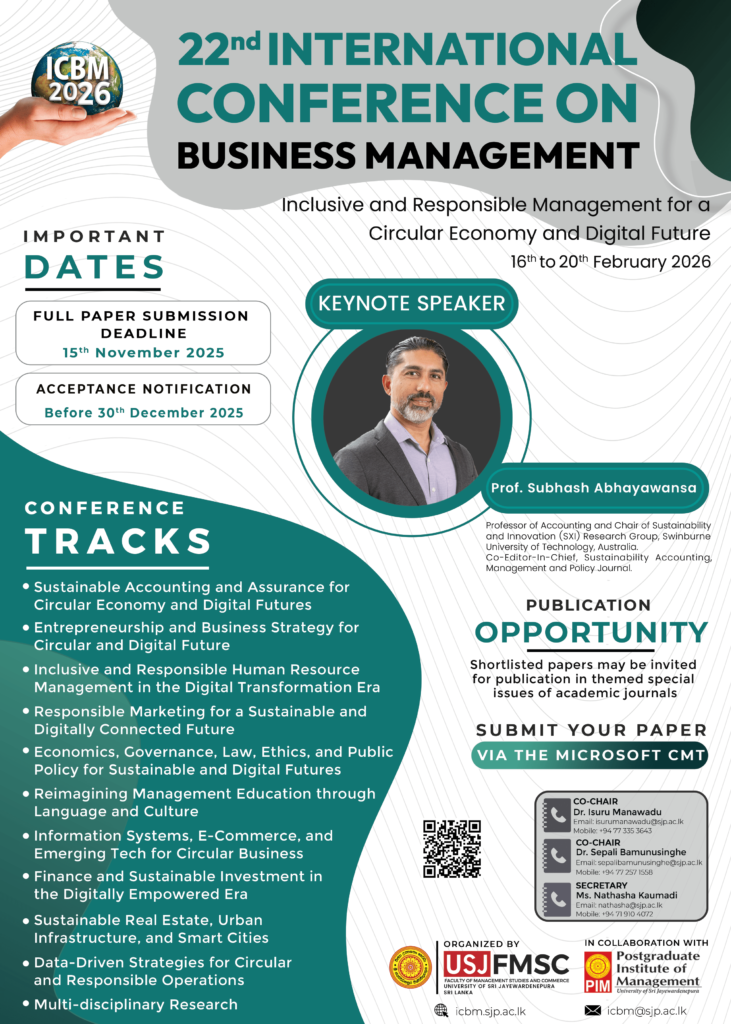 The main conference of ICBM 2026 serves as a beacon for high-quality research, bringing together local and international scholars to delve into the theme of “Inclusive and Responsible Management for a Circular Economy and Digital Future”. Hosted at the prestigious University of Sri Jayewardenepura, this year’s conference features ten comprehensive tracks, each dedicated to exploring innovative approaches and breakthroughs in management disciplines. To ensure the quality of the papers, the manuscripts will be going through a doble-blind review process. Join us as we navigate the dynamic landscape of business management, leveraging disruptive technologies to shape a sustainable future.