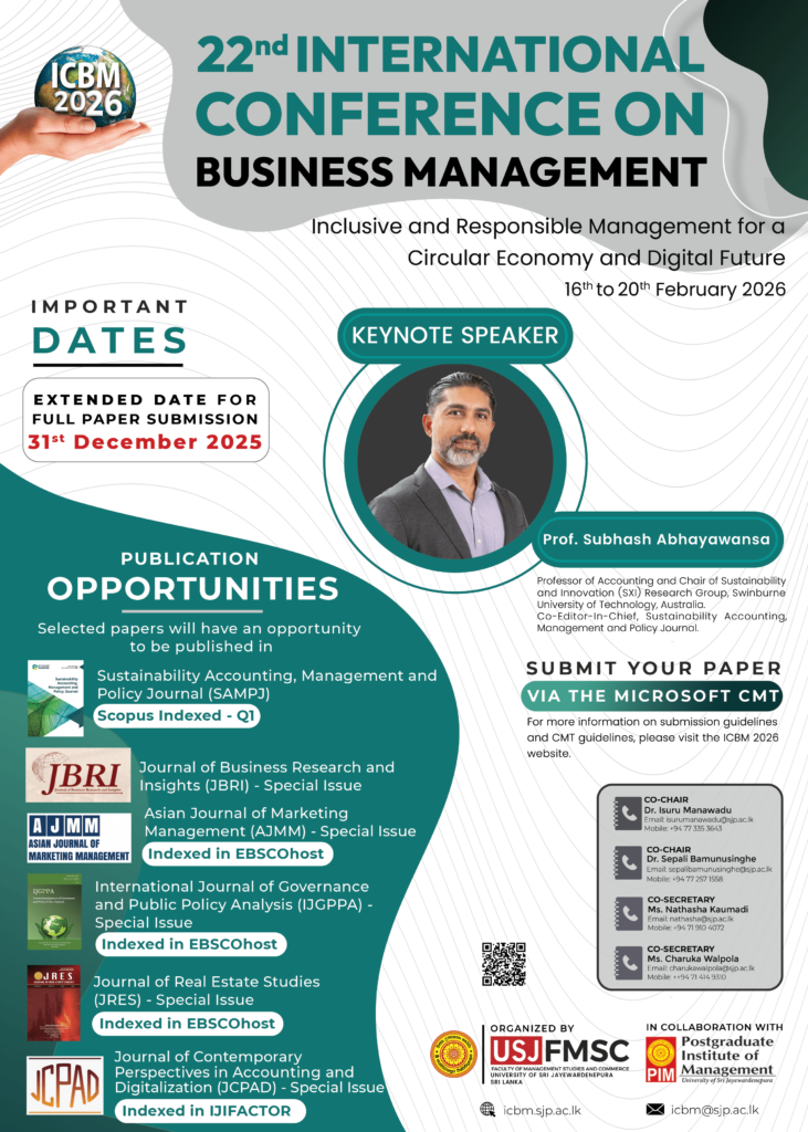 Please note that the following information applies exclusively to authors whose papers have been accepted for presentation at the International Conference on Business Management (ICBM) 2026, organized by the Faculty of Management Studies and Commerce (FMSC) in collaboration with the Postgraduate Institute of Management (PIM), University of Sri Jayewardenepura (USJ).