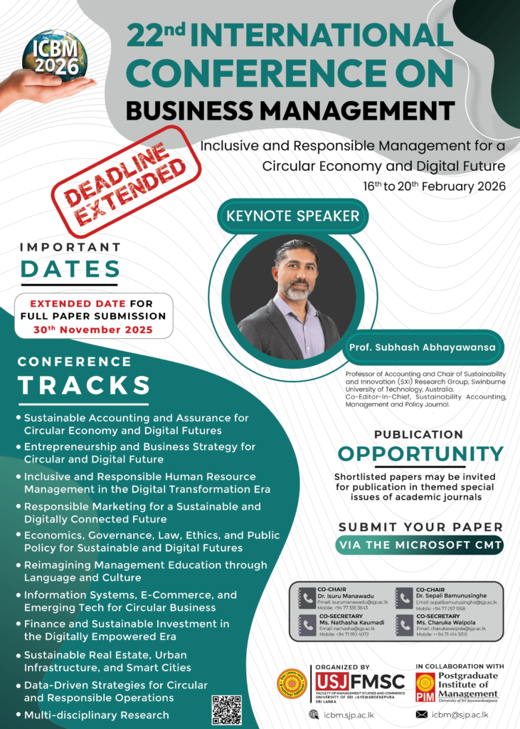 The main conference of ICBM 2026 serves as a beacon for high-quality research, bringing together local and international scholars to delve into the theme of “Inclusive and Responsible Management for a Circular Economy and Digital Future”. Hosted at the prestigious University of Sri Jayewardenepura, this year’s conference features ten comprehensive tracks, each dedicated to exploring innovative approaches and breakthroughs in management disciplines. To ensure the quality of the papers, the manuscripts will be going through a doble-blind review process. Join us as we navigate the dynamic landscape of business management, leveraging disruptive technologies to shape a sustainable future.