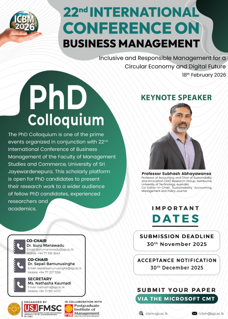 One of the main events for PhD candidates from around the world who are just commencing their dissertation work is the PhD Colloquium, which is organized in conjunction with the 22nd International Conference on Business Management by the Faculty of Management Studies and Commerce, University of Sri Jayewardenepura. The PhD Colloquium will take place at the University’s premises as a physical event on 18th February 2026.